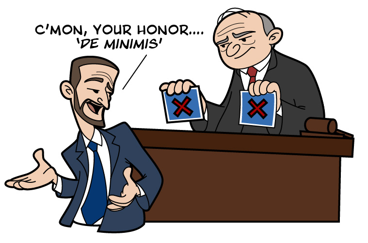 There is a Latin maxim: de minimis non curat lex: The law does not care about the smallest thing. De minimis, in legal terms, means the thing is too trivial or minor to merit consideration. In the context of intellectual property infringement, the de minimis defense has commonly been understood to mean that a defendant carrying out a small number of activities within the scope of a claim might avoid liability for infringement.